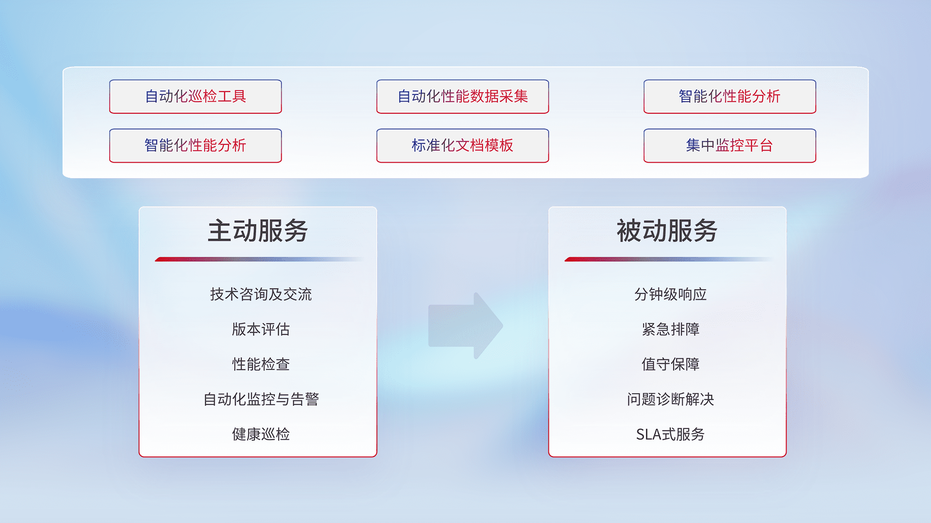 智能化工具和标准化文档,,,保障服务质量,,,提供主动服务(包含技术咨询、、、、版本评估、、、性能检查、、、、自动化监控与告警、、、健康巡检)和被动服务包含(分钟级响应、、、紧急排障、、、值守保障、、、问题诊断解决、、SLA服务)。。。。